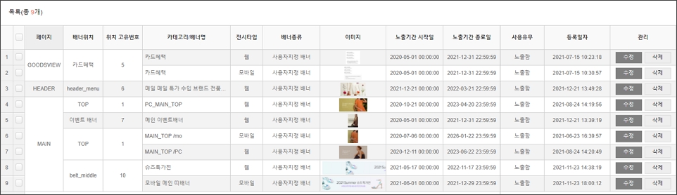 - 목록 : 검색된 배너의 관리 영역에서 [수정] 및 [삭제]하거나, 배너 상세 등록 정보을 확인할 수 있습니다.