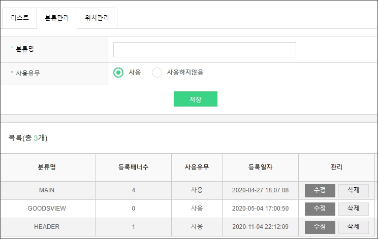 - 신규등록 : '분류명', '사용유무' 기재 및 선택 후 [저장] 버튼을 클릭하면 통합배너 분류가 신규 등록이 되며,