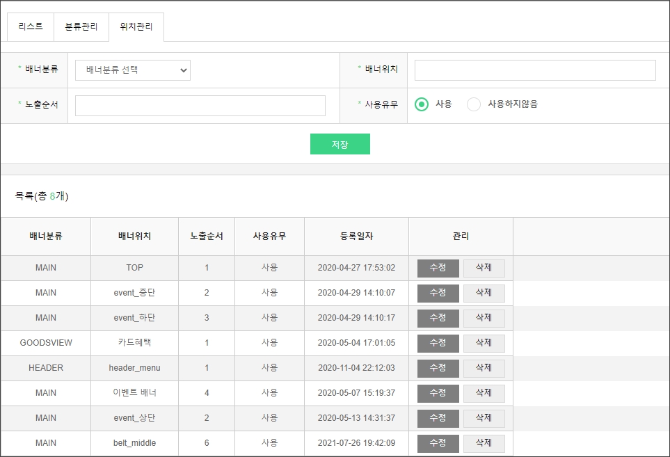 - 관리 영역의 [수정] 버튼 선택 시 상위 영역에 기 설정된 값이 노출되며, '배너분류', '배너위치', '노출순서', '사용유무' 를 수정할 수 있습니다.
