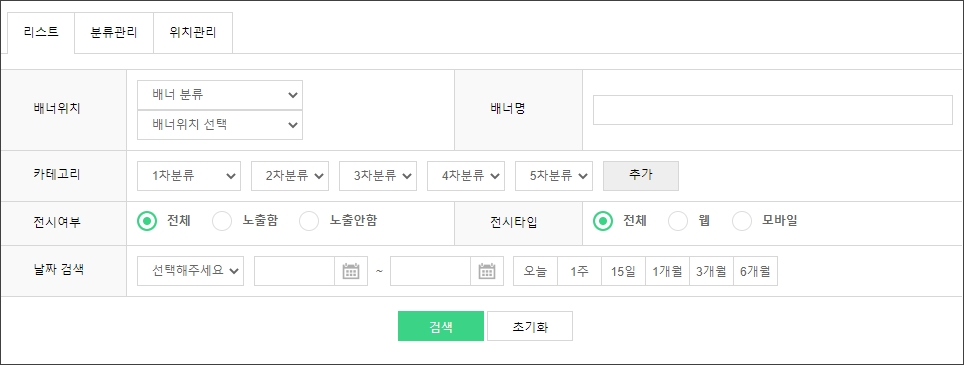 - 날짜 검색 : 배너 등록일 또는 노출기간 종료일에 따른 구분 조건 선택하여 필터링 된 목록을 확인할 수 있습니다.