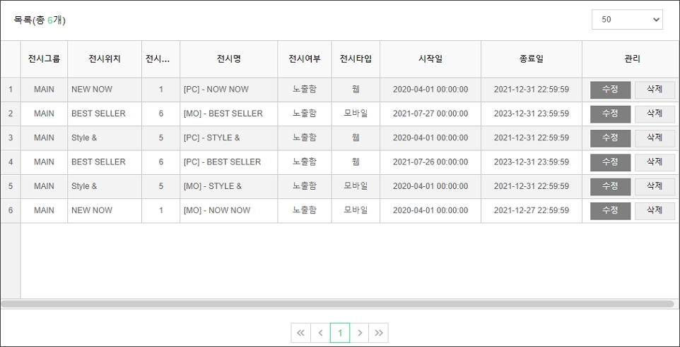 메인전시 리스트 관리 영역의 [수정]버튼 선택하여 진입한 경우, 기 등록된 정보가 노출되며, 수정이 가능합니다.