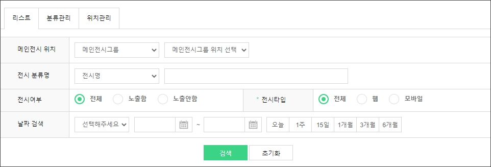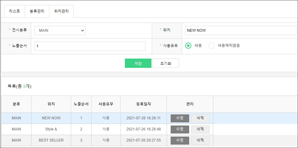 - 신규등록 : '전시분류', '위치', '노출순서', '사용유무' 기재 및 선택 후 [저장] 버튼을 클릭하면 신규 등록이 되며,