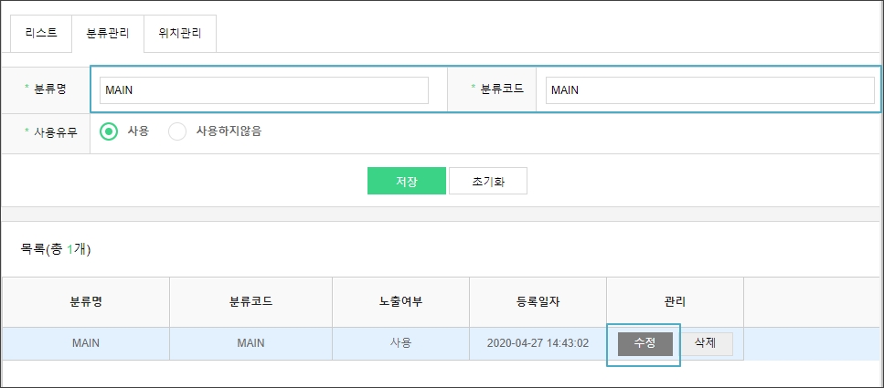- [수정] : 관리 영역의 [수정] 버튼 선택 시 상위 영역에 기 설정된 값이 노출되며, '분류명', '분류코드'를 수정할 수 있습니다.