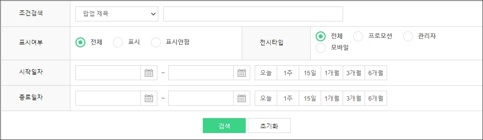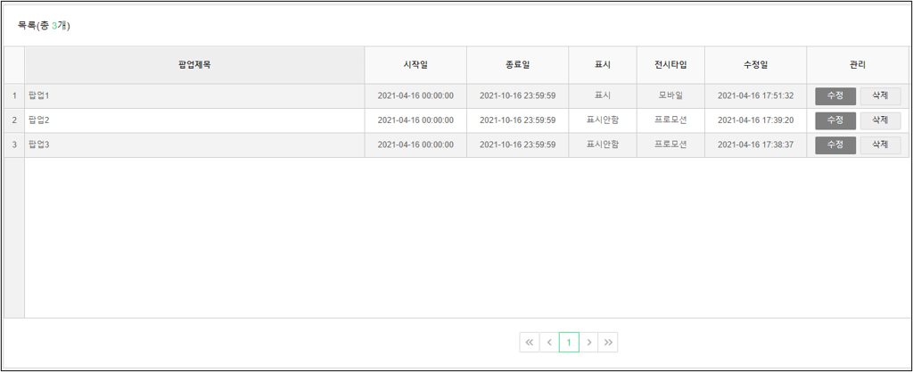 프로모션/전시 메인 전시관리 메인전시 리스트 메인전시 등록/수정 프로모션 전시관리 프로모션 전시 리스트 프로모션 전시 등록/수정 프로모션 전시 분류 설정 분류 전시관리 분류별 메인전시 리스트 분류별 메인전시 등록/수정 팝업관리 팝업 리스트 팝업 등록/수정 이벤트/기획전 관리 이벤트/기획전 리스트 이벤트/기획전 등록/수정 통합배너관리 통합배너 리스트 통합배너 등록/수정 팝업 리스트 프론트에 노출되는 팝업 목록을 확인하고 관리 할 수 있습니다. 1. 팝업 리스트 관리자 화면 - 검색 : '팝업제목', '표시여부', '전시타입', '시작일자', '종료일자' 등의 조건 선택 하여 검색 할 수 있습니다. 관리자 화면 - 목록 : 위에서 선택 된 조건값에 대한 검색 결과 목록이 노출 됩니다. 검색을 하지 않았을 경우 전체 목록이 노출 됩니다. '팝업제목', '시작일', '종료일', '표시', '전시타입', '등록일'을 확인 할 수 있습니다. - [수정] : 해당 버튼 선택 시 팝업 등록/수정 페이지로 이동합니다.