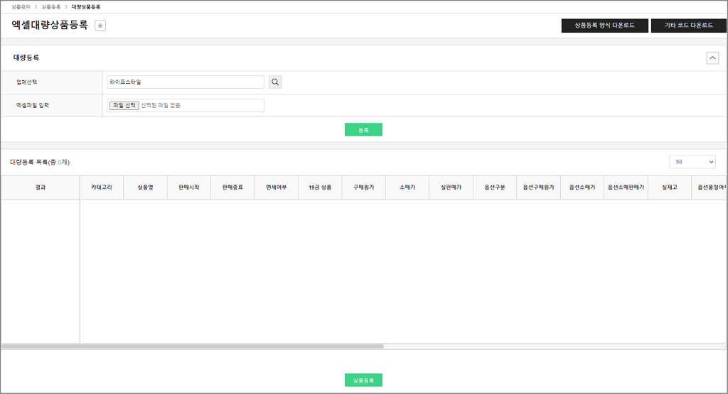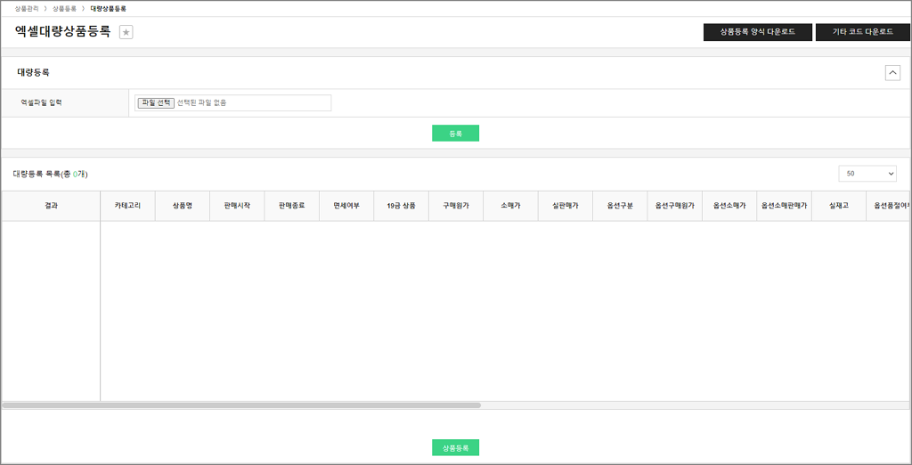 상품관리 상품기초정보관리 전시분류설정 브랜드관리 원산지관리 제조사관리 전자상거래 상품고시정보 아이콘관리 이미지 사이즈 관리 상품등록 개별상품등록 대량상품등록 상품리스트 상품리스트 상품승인대기 상품승인거부 상품수정대기 상품수정거부 상품일괄관리 카테고리 판매기간/상태/노출 배송정책 담당MD 대량상품등록 대량의 상품을 엑셀 파일로 등록 하거나, 수정할 수 있습니다. # 셀러관리 플러그인을 이용중이라면 ? ▶ 본사 기준 가이드 바로가기 ▶ 셀러업체 기준 가이드 바로가기 ▶ 본사 기준 1. 대량등록 관리자 화면 - [상품등록 양식 다운로드] : 해당 양식을 다운 받아 엑셀파일 작성 시 사용합니다. 엑셀파일 화면 - [기타 코드 다운로드] : 양식 내에 들어갈 기타 코드들을 해당 파일에서 확인할 수 있습니다. - 업체선택 : 대량 등록 할 상품의 판매자를 선택합니다. (본사, 셀러 등등) - 엑셀파일 입력 : 상품등록 양식을 참고하여 작성된 엑셀 파일을 선택한 후 [등록] 버튼을 눌러 업로드합니다. - 대량등록 목록 : 업로드한 엑셀파일의 목록이 노출되며, 정상 등록 유무가 [결과] 영역에 나타납니다. 이상이 없으면 [상품등록] 버튼을 눌러 최종 등록을 완료합니다. ▶ 셀러업체 기준 1. 대량등록 관리자 화면 - [상품등록 양식 다운로드] : 해당 양식을 다운 받아 엑셀파일 작성 시 사용합니다. - [기타 코드 다운로드] : 양식 내에 들어갈 기타 코드들을 해당 파일에서 확인할 수 있습니다. - 엑셀파일 입력 : 상품등록 양식을 참고하여 작성된 엑셀 파일을 선택한 후 [등록] 버튼을 눌러 업로드합니다. - 대량등록 목록 : 업로드한 엑셀파일의 목록이 노출되며, 정상 등록 유무가 [결과] 영역에 나타납니다. 이상이 없으면 [상품등록] 버튼을 눌러 최종 등록을 완료합니다.