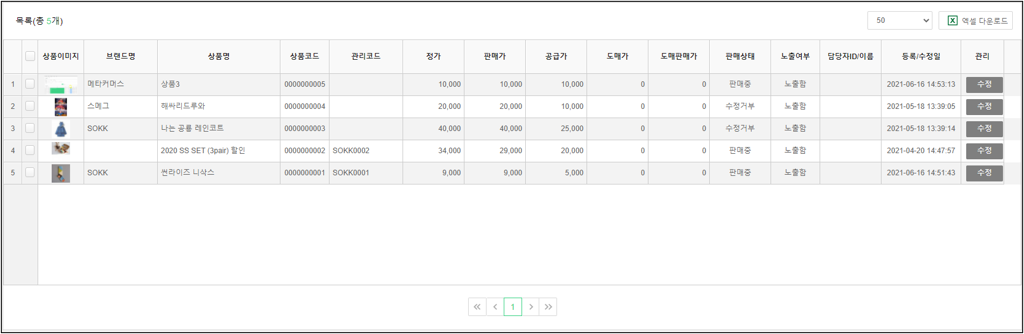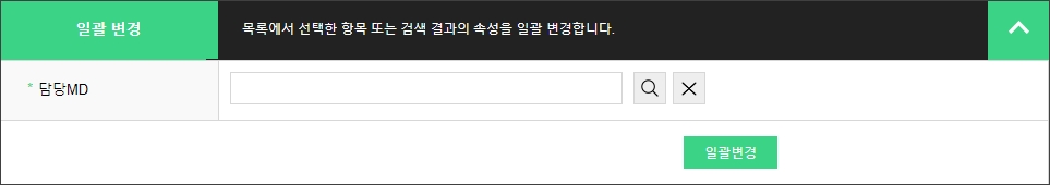 상품관리 상품기초정보관리 전시분류설정 브랜드관리 원산지관리 제조사관리 전자상거래 상품고시정보 아이콘관리 이미지 사이즈 관리 상품등록 개별상품등록 대량상품등록 상품리스트 상품리스트 상품승인대기 상품승인거부 상품수정대기 상품수정거부 상품일괄관리 카테고리 판매기간/상태/노출 배송정책 담당MD 담당MD 담당MD를 일괄변경할 수 있는 페이지입니다. 1. 담당MD 관리자 화면 - 상품검색 : 상품 검색조건을 입력 및 선택하여 필터링 된 목록을 확인할 수 있습니다. 관리자 화면 - 상품목록 : 상품이미지, 브랜드명, 상품명, 상품코드, 관리코드, 정가, 판매가, 공급가, 판매상태, 노출여부, 판매기간, 등록/수정일 정보를 확인할 수 있습니다. - [수정] : 버튼 선택 시 상품의 정보를 수정할 수 있는 페이지로 이동합니다. 관리자 화면 - 일괄변경 : 목록 영역에서 선택된 상품의 담당MD를 일괄 변경할 수 있습니다.