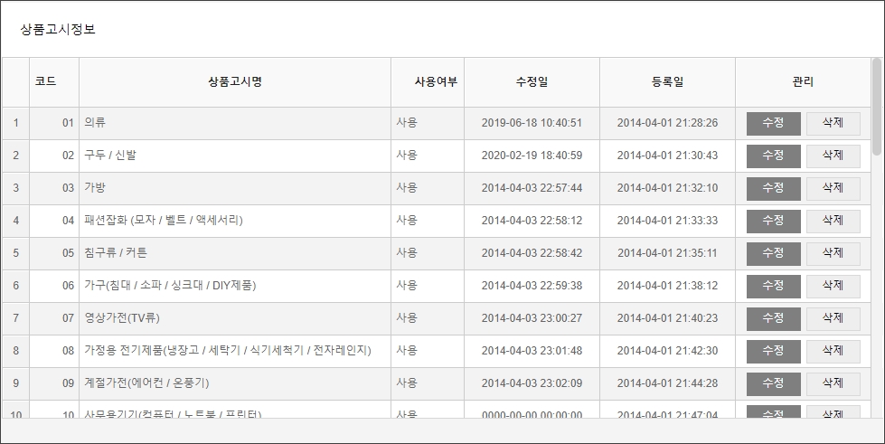 - 상품고시정보목록 : 코드, 상품고시명, 사용여부, 수정일, 등록일 정보를 확인할 수 있습니다.