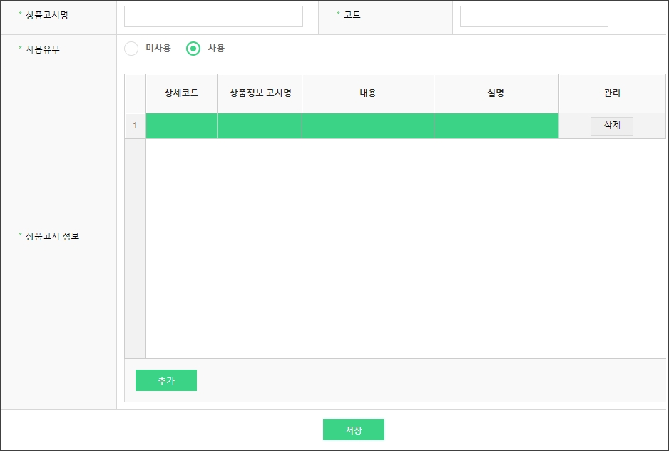 - 추가 : 버튼 선택 시, 상품고시 정보 내 입력영역 (녹색 부분) 노출되며 상세코드, 상품정보 고시명, 내용, 설명을 입력할 수 있습니다.