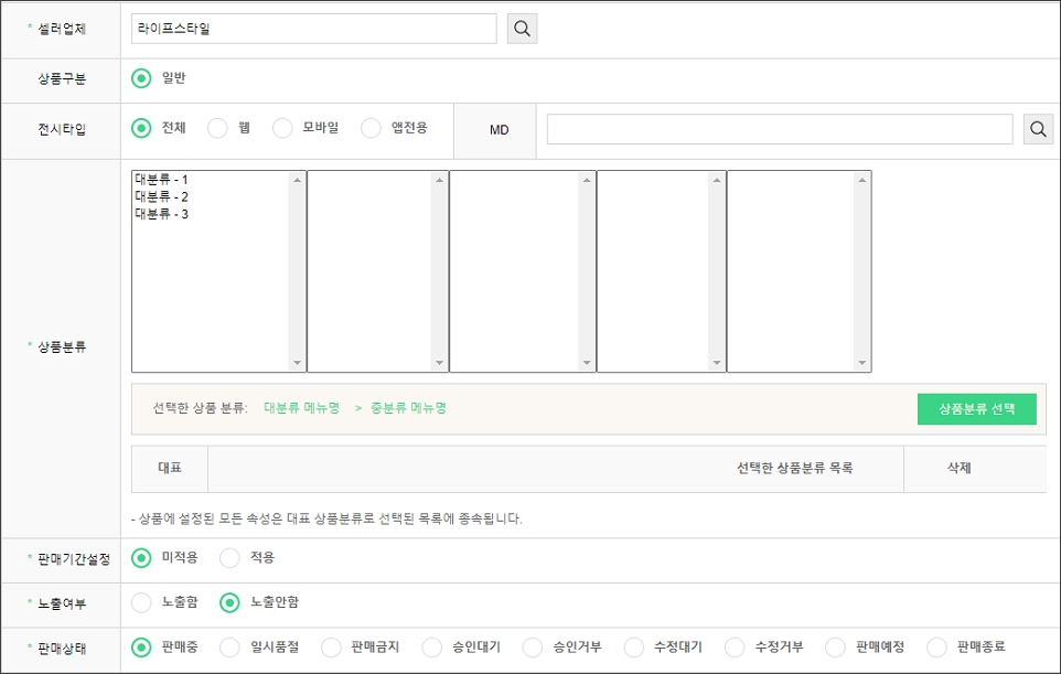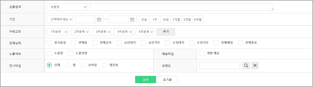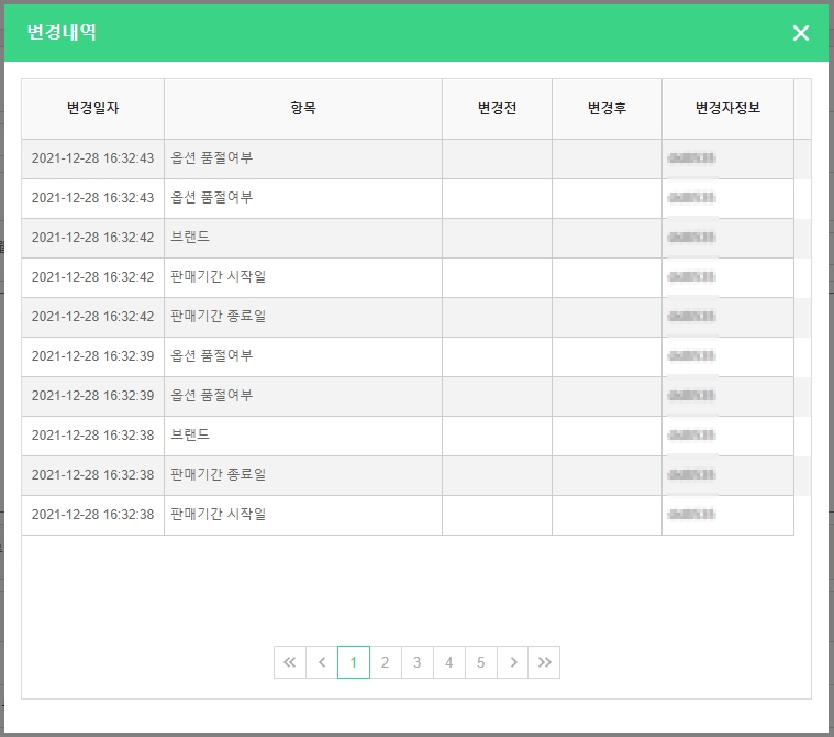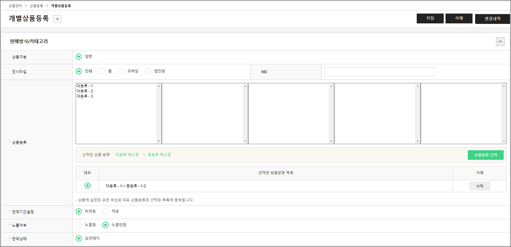 상품관리 상품기초정보관리 전시분류설정 브랜드관리 원산지관리 제조사관리 전자상거래 상품고시정보 아이콘관리 이미지 사이즈 관리 상품등록 개별상품등록 대량상품등록 상품리스트 상품리스트 상품승인대기 상품승인거부 상품수정대기 상품수정거부 상품일괄관리 카테고리 판매기간/상태/노출 배송정책 담당MD 상품리스트 Admin에 등록된 모든 상품을 확인 및 관리할 수 있는 페이지입니다. # 셀러관리 플러그인을 이용중이라면 ? ▶ 본사 기준 가이드 바로가기 ▶ 셀러업체 기준 가이드 바로가기 ▶ 본사 기준 1. 상품리스트 관리자 화면 - 셀러업체 : [돋보기] 버튼을 클릭하여 상품의 판매자를 선택하여 검색할 수 있습니다. - 검색조건 영역 : 상품 검색조건을 입력 및 선택하여 필터링 된 목록을 확인할 수 있습니다. 관리자 화면 - 상품목록 : 상품이미지, 브랜드명, 상품명, 상품코드, 관리코드, 정가, 판매가, 공급가, 도매가, 도매판매가, 판매상태, 노출여부, 등록/수정일 정보를 확인할 수 있습니다. - [엑셀 다운로드] : 현재 검색된 상품 목록을 엑셀문서로 다운로드 할 수 있습니다. - 상품이미지 : 이미지 영역에 마우스 오버 시 미리보기 레이어가 노출됩니다. - [수정] : 버튼 선택 시 상품의 정보를 수정할 수 있는 페이지로 이동합니다. 2. 상품수정 기 등록된 상품의 수정 페이지입니다. 상품 신규등록하는 경우에는 ‘저장’버튼만 노출되지만 기 등록된 상품의 수정페이지에서는 [저장, 삭제, 변경내역] 버튼이 노출됩니다. 관리자 화면 - [삭제] : 버튼 선택 시, 해당 상품이 삭제됩니다. 단, 삭제는 판매상태가 판매금지, 판매종료일때만 삭제 가능합니다. - [변경내역] : 버튼 선택 시, 변경내역 팝업이 노출됩니다. 관리자 화면_'변경내역' 선택 시 팝업 예시 - 변경내역 팝업 : 변경일자, 항목, 변경전, 변경후, 변경자정보를 확인할 수 있습니다. ▶ 셀러업체 기준 1. 상품리스트 관리자 화면 - 검색조건 영역 : 상품 검색조건을 입력 및 선택하여 필터링 된 목록을 확인할 수 있습니다. 관리자 화면 - 상품목록 : 상품이미지, 브랜드명, 상품명, 상품코드, 관리코드, 정가, 판매가, 공급가, 도매가, 도매판매가, 판매상태, 노출여부, 등록/수정일 정보를 확인할 수 있습니다. - [엑셀 다운로드] : 현재 검색된 상품 목록을 엑셀문서로 다운로드 할 수 있습니다. - 상품이미지 : 이미지 영역에 마우스 오버 시 미리보기 레이어가 노출됩니다. - [수정] : 버튼 선택 시 상품의 정보를 수정할 수 있는 페이지로 이동합니다. 2. 상품수정 기 등록된 상품의 수정 페이지입니다. 상품 신규등록하는 경우에는 ‘저장’버튼만 노출되지만 기 등록된 상품의 수정페이지에서는 [저장, 삭제, 변경내역] 버튼이 노출됩니다. 관리자 화면 - [저장] : 버튼 선택 시, 수정된 정보가 저장되며 상품의 판매상태는 '수정대기'로 반영되어 본사 승인 후 '판매중'으로 노출 가능합니다. - [삭제] : 버튼 선택 시, 해당 상품이 삭제됩니다. 단, 삭제는 판매상태가 판매금지, 판매종료일때만 삭제 가능합니다. - [변경내역] : 버튼 선택 시, 변경내역 팝업이 노출됩니다. 관리자 화면_'변경내역' 선택 시 팝업 예시 - 변경내역 팝업 : 변경일자, 항목, 변경전, 변경후, 변경자정보를 확인할 수 있습니다.