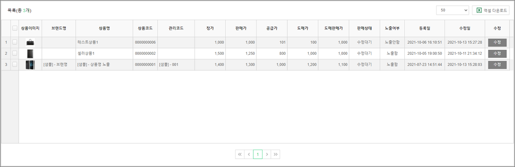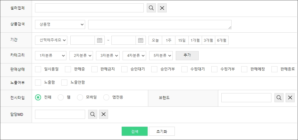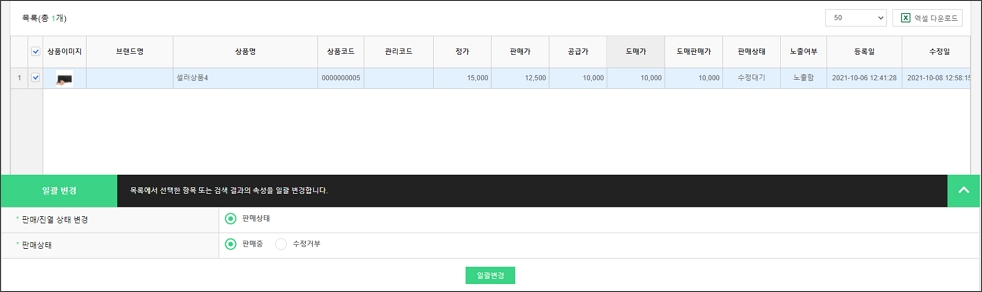상품관리 상품기초정보관리 전시분류설정 브랜드관리 원산지관리 제조사관리 전자상거래 상품고시정보 아이콘관리 이미지 사이즈 관리 상품등록 개별상품등록 대량상품등록 상품리스트 상품리스트 상품승인대기 상품승인거부 상품수정대기 상품수정거부 상품일괄관리 카테고리 판매기간/상태/노출 배송정책 담당MD 상품수정대기 해당 메뉴는 메타커머스 셀러관리 플러그인을 설치한 관리자에게만 노출되는 페이지입니다. 셀러업체가 기존 판매중이던 상품을 수정했을 경우 해당 상품수정대기 목록에서 확인할 수 있으며, 본사는 수정된 내용을 검토 후 판매상태를 설정할 수 있습니다. 1. 상품리스트 관리자 화면 - 셀러업체 : [돋보기] 버튼을 클릭하여 상품의 판매자를 선택하여 검색할 수 있습니다. - 검색조건 영역 : 상품의 상세 검색조건을 입력 및 선택하여 필터링 된 목록을 확인할 수 있습니다. 관리자 화면 - 상품목록 : 상품이미지, 브랜드명, 상품명, 상품코드, 관리코드, 정가, 판매가, 공급가, 도매가, 도매판매가, 판매상태, 노출여부, 등록/수정일 정보를 확인할 수 있습니다. - [엑셀 다운로드] : 상품 목록을 엑셀문서로 다운로드 할 수 있습니다. - 상품이미지 : 이미지 영역에 마우스 오버 시 미리보기 레이어가 노출됩니다. - [수정] : 버튼 선택 시 상품의 상세 정보를 확인할 수 있는 페이지로 이동합니다. 2. 상품 상세 확인 [수정] 버튼 선택 시 진입하는 상품 상세 페이지입니다. 셀러업체가 수정한 상품의 상세 내용을 검수하여 판매의 적합성을 판단합니다. 규정에 어긋나는 상품 정보 발견 시, 본사는 판매상태를 제한할 수 있습니다. 관리자 화면 - 셀러업체 : 상품을 등록한 셀러업체명이 노출됩니다. - 판매상태 : 셀러업체가 등록한 해당 상품의 상태값을 검수결과에 따라 변경할 수 있습니다. 3. 상품 판매상태 일괄 변경 상품승인대기 목록에서 판매상태를 변경할 상품을 선택한 후 아래 일괄 변경에서 '판매중', '승인거부'를 구분하여 변경합니다. 관리자 화면 - 판매중 : 검수 완료 후 승인할 상품을 선택하여 '판매중'으로 상태값을 변경하면 쇼핑몰에 재판매될 수 있도록 노출됩니다. - 수정거부 : 수정된 상품 상세 내용 검수 후 판매 비적합으로 판단된 상품을 수정(승인)거부 처리합니다.