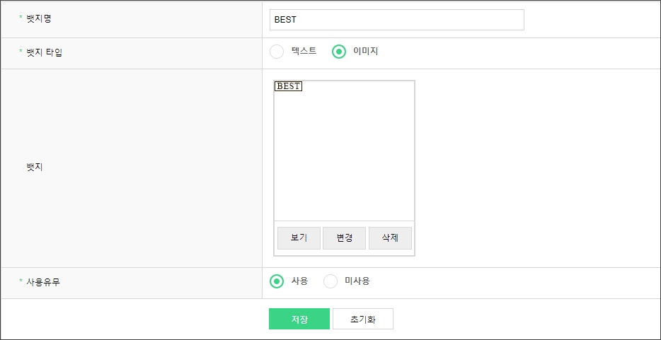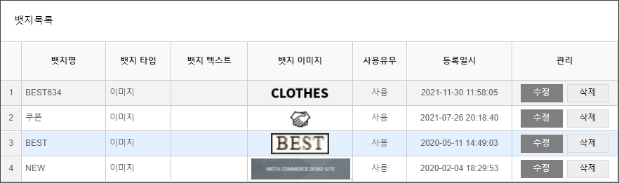 상품관리 상품기초정보관리 전시분류설정 브랜드관리 원산지관리 제조사관리 전자상거래 상품고시정보 아이콘관리 이미지 사이즈 관리 상품등록 개별상품등록 대량상품등록 상품리스트 상품리스트 상품승인대기 상품승인거부 상품수정대기 상품수정거부 상품일괄관리 카테고리 판매기간/상태/노출 배송정책 담당MD 아이콘 관리 개별상품등록 시 사용가능한 아이콘(뱃지)을 등록하는 페이지입니다. 상품 강조, 정보 전달을 위한 아이콘(뱃지) 설정을 할 수 있습니다. 1. 상품 아이콘(뱃지) 관리 관리자 화면 - 아이콘(뱃지) 등록 : 뱃지명, 뱃지타입, 뱃지 이미지 파일, 사용유무를 입력 또는 선택하여 아이콘(뱃지)을 등록할 수 있습니다. - '사용유무' 선택 시, 개별상품등록 페이지 > 기타정보 > 아이콘노출 영역에 노출됩니다. 2. 아이콘(뱃지) 목록 관리자 화면 - 아이콘 목록 : 아이콘(뱃지)명, 아이콘(뱃지) 타입, 아이콘(뱃지) 텍스트,이미지, 사용유무, 등록일시 정보를 확인할 수 있습니다. - 관리 : [수정] 버튼 선택 시, 아이콘(뱃지)등록 영역에 기존 등록된 정보가 노출되며 수정 또는 초기화 할 수 있습니다. 관리자 화면 tip ! 아이콘과 관련된 정보 알아보기 아이콘 활용 방법, 조금 더 쉽게 알아보기