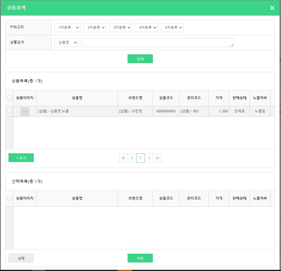 - 상품목록 내에서 등록 원하는 상품을 선택 후 [추가] 버튼을 클릭합니다.