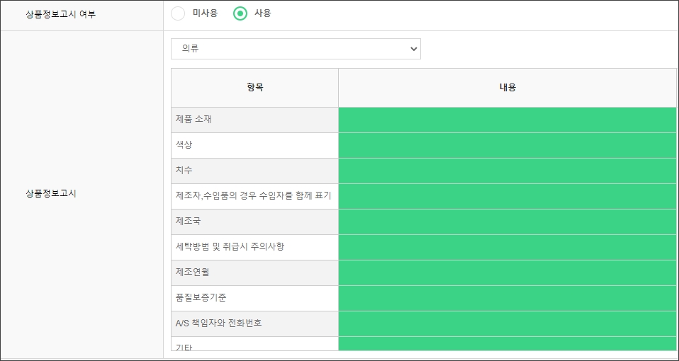 - 상품정보고시 여부 : ‘사용’ 선택 시, 하단에 상품정보고시 영역이 노출됩니다.