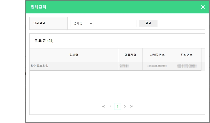 ② 목록 : 업체명, 대표자명, 사업자번호, 전화번호 정보를 확인할 수 있으며, 목록 내 항목영역 더블 클릭 시,
