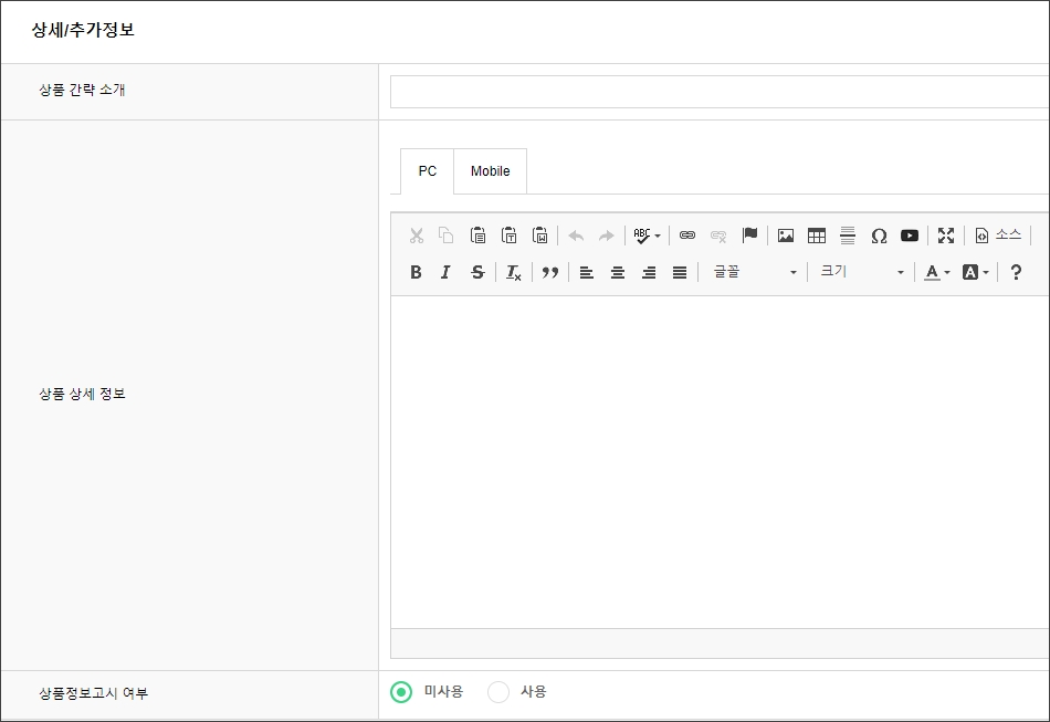 - 상품 상세정보 : 상품 상세페이지에 노출되는 설명을 입력할 수 있는 에디터 영역입니다.