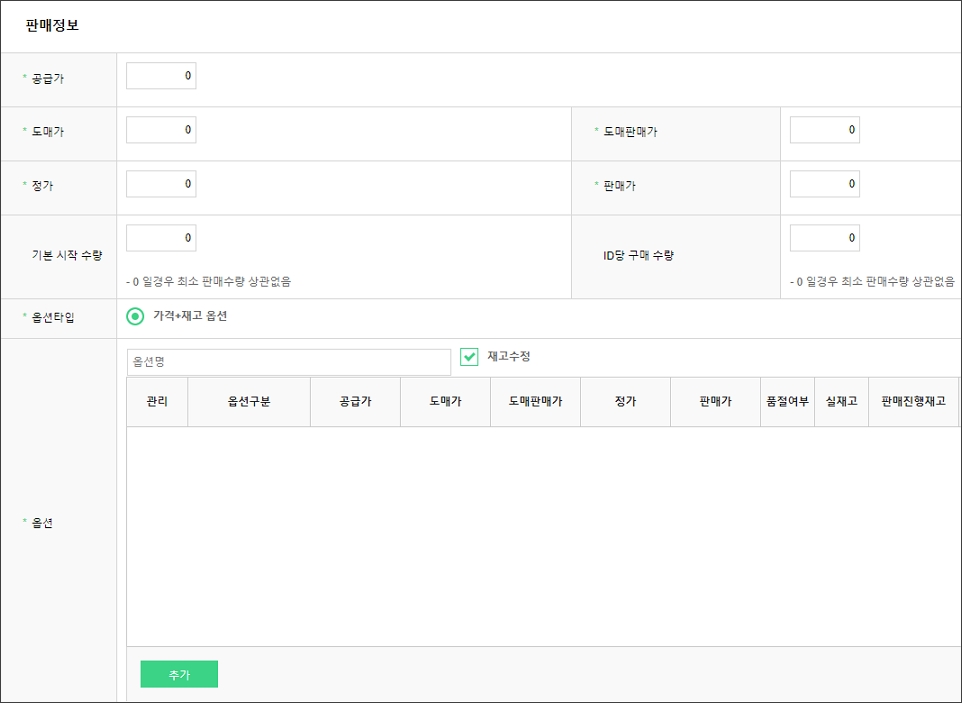 쇼핑몰에 판매될 상품의 판매가 및 상품옵션을 입력 및 등록하는 영역입니다.