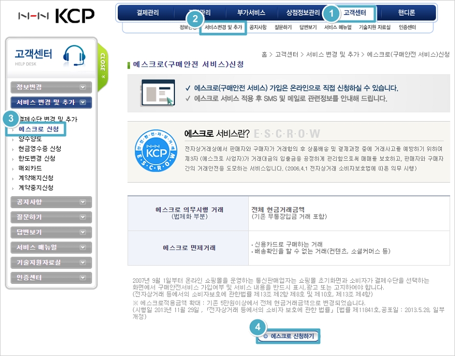 NHN KCP 가입 당시 에스크로를 신청하지 않으셨다면 아래와 같은 방법으로 신청 가능합니다.